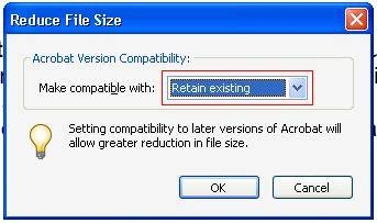 4- Use the “Make compatible with” drop down menu to select a version of Acrobat reader that the reduced file size will be compatible with. As noted on the “Reduce File Size” window, a greater reduction in file size will be possible when setting the compatibility to a later version of Acrobat.