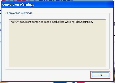 8- Click once on the “OK” button on the pop up window alerting that not all images contained in the PDF file were downsized. This will not always occur. If you do not receive this message, then skip to step 9.