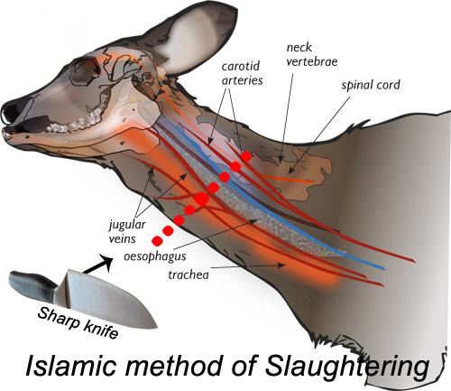The swift cutting of vessels of the neck disconnects the flow of blood to the nerve of the brain responsible for pain. Thus the animal does not feel pain. While dying, the animal struggles, writhers, shakes and kicks, not due to pain, but due to the contraction and relaxation of the muscles deficient in blood and due to the flow of blood out of the body.